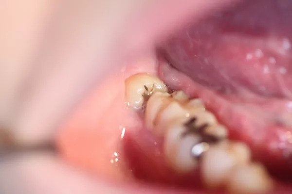 歯ぎしりがひどくなると、下の写真のように歯が削れてしまいます。